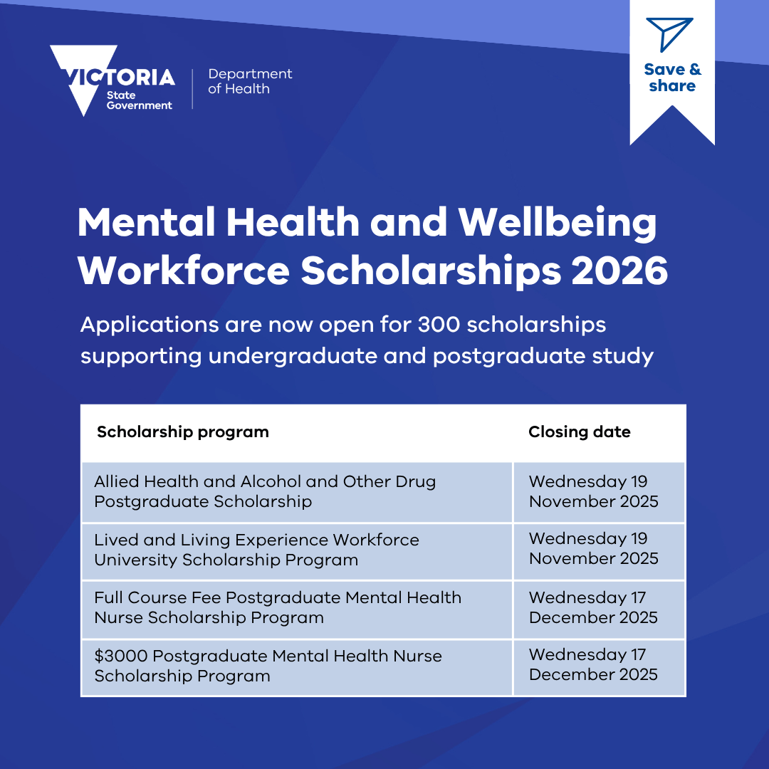 The Allied Health & AOD Scholarships are designed to support eligible allied health and AOD workers to undertake postgraduate studies in semester 2, 2025 and semester 1, 2026.